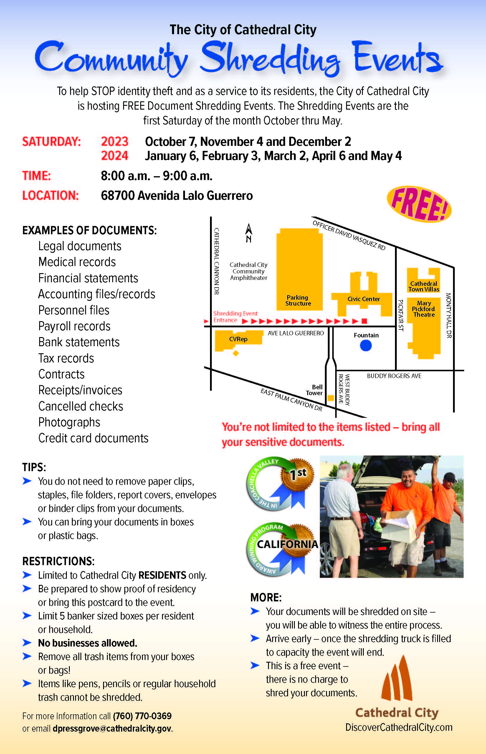 To help STOP identity theft and as a service to its residents, the City of Cathedral City is hosting FREE Document Shredding Events. The Shredding Events are the first Saturday of the month October thru May.